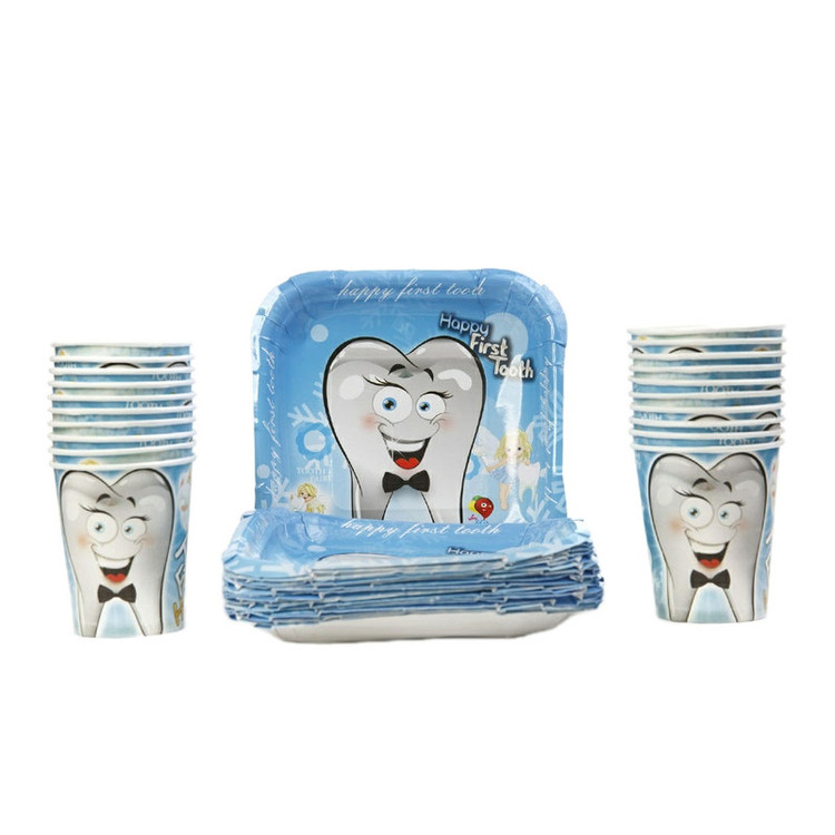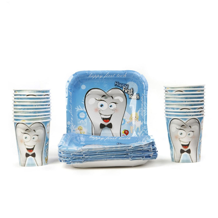 بشقاب و لیوان دندونی پسر در بسته های 20 عددی به فروش میرسد . در بسته های این محصول 10عدد بشقاب کاغذی به ابعاد 17x19 سانتی متر و 10عدد لیوان کاغذی به ارتفاع 9 سانتی متر و قطر بالایی 7 سانتی متر عرضه میگردد . لازم به ذکر است بشقاب های کاغذی دارای مقاومت کمی هستند و برای سرو کیک بسیار مناسب بوده و برای میوه و خوراکیهای سنگین مناسب نیستند .