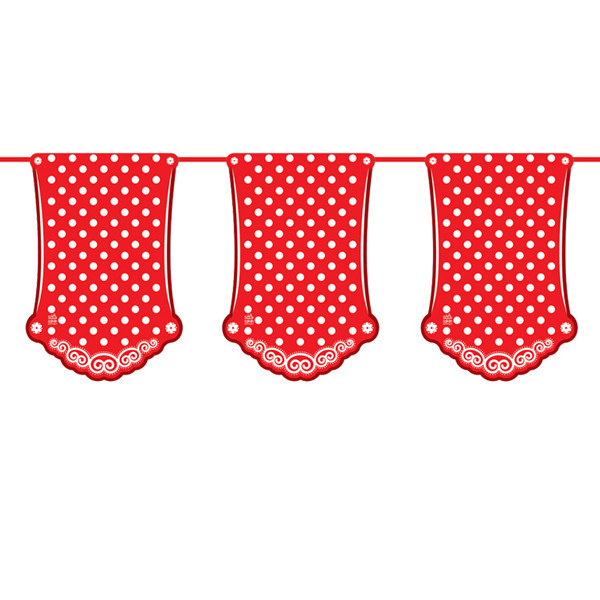 ریسه پرچم تم تولد قرمز خال سفید یکی از لوازم محبوب تولد است. ریسه پرچم قرمز خال سفید در طول 3 متر با تعداد 10 عدد برگه هفتی و هشتی از جنس مقوای گلاسه به ابعاد 15x23 سانتی متر و در فاصله یکسان به ربان وصل شده که خال خالی های سفید بر روی برگه های قرمز ریسه چاپ شده است. طراحی ریسه پرچم قرمز خال سفید بسیار شکیل و زیباست و جهت تزیین مراسم تولد در نظر گرفته شده است، همچنین با توجه به ساده بودن این تم می توانید برای انواع مراسم جشن و تولد و مهمانی های خود استفاده کنید.