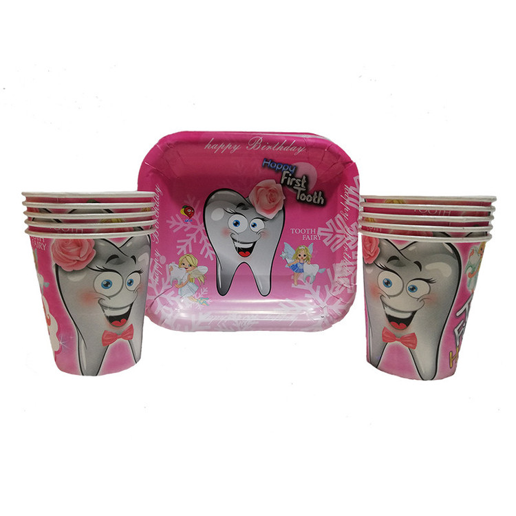 بشقاب و لیوان دندونی دختر در بسته های 20 عددی به فروش میرسد . در بسته های این محصول 10عدد بشقاب کاغذی به ابعاد 17x19 سانتی متر و 10عدد لیوان کاغذی به ارتفاع 9 سانتی متر و قطر بالایی 7 سانتی متر عرضه میگردد . لازم به ذکر است بشقاب های کاغذی دارای مقاومت کمی هستند و برای سرو کیک بسیار مناسب بوده و برای میوه و خوراکیهای سنگین مناسب نیستند .
